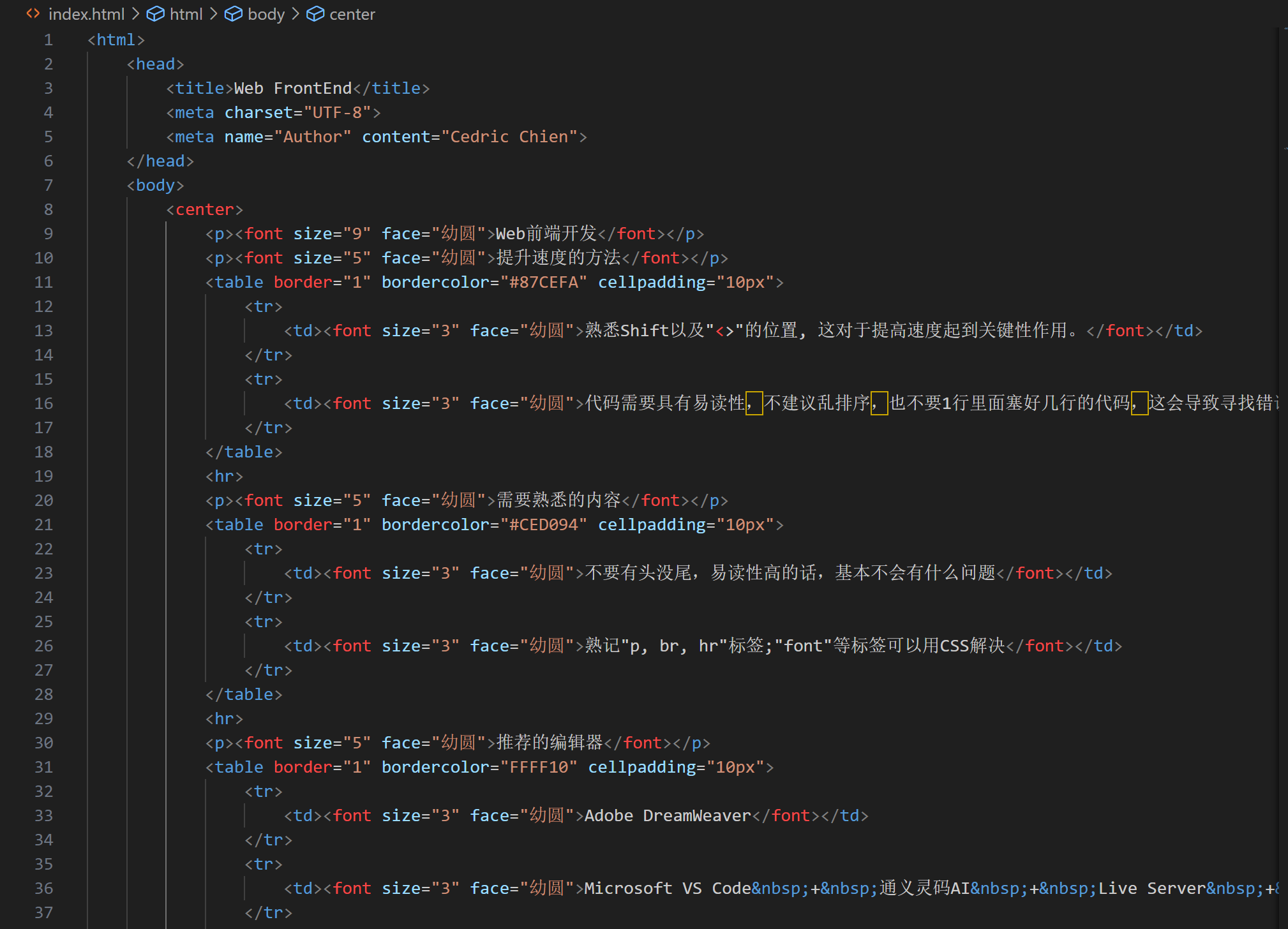 | 熟记"p, br, hr"标签;"font"等标签可以用CSS解决 |